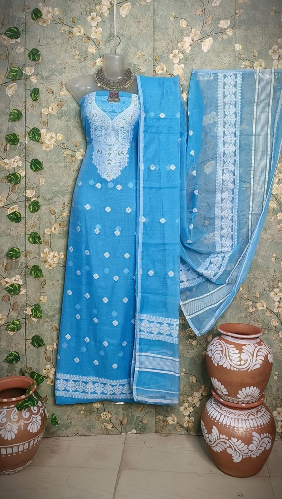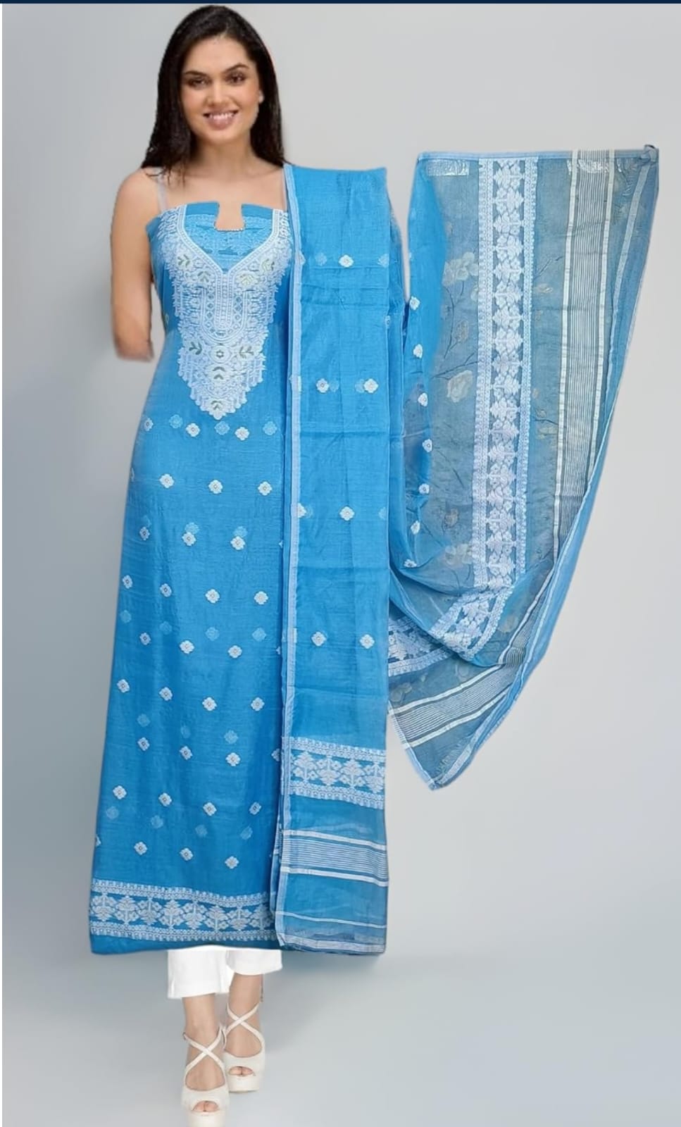 This striking kurta set features a sleeveless blue kameez adorned with white floral and geometric embroidery, concentrated around the neckline and subtly scattered across the fabric. The matching blue dupatta carries coordinated embroidery and border detailing, adding depth and elegance to the ensemble. Paired with white straight-cut pants and white strappy heels, the outfit offers a clean, modern silhouette with traditional charm. Ideal for festive occasions, cultural events, or semi-formal gatherings, this set blends bold color with refined craftsmanship.