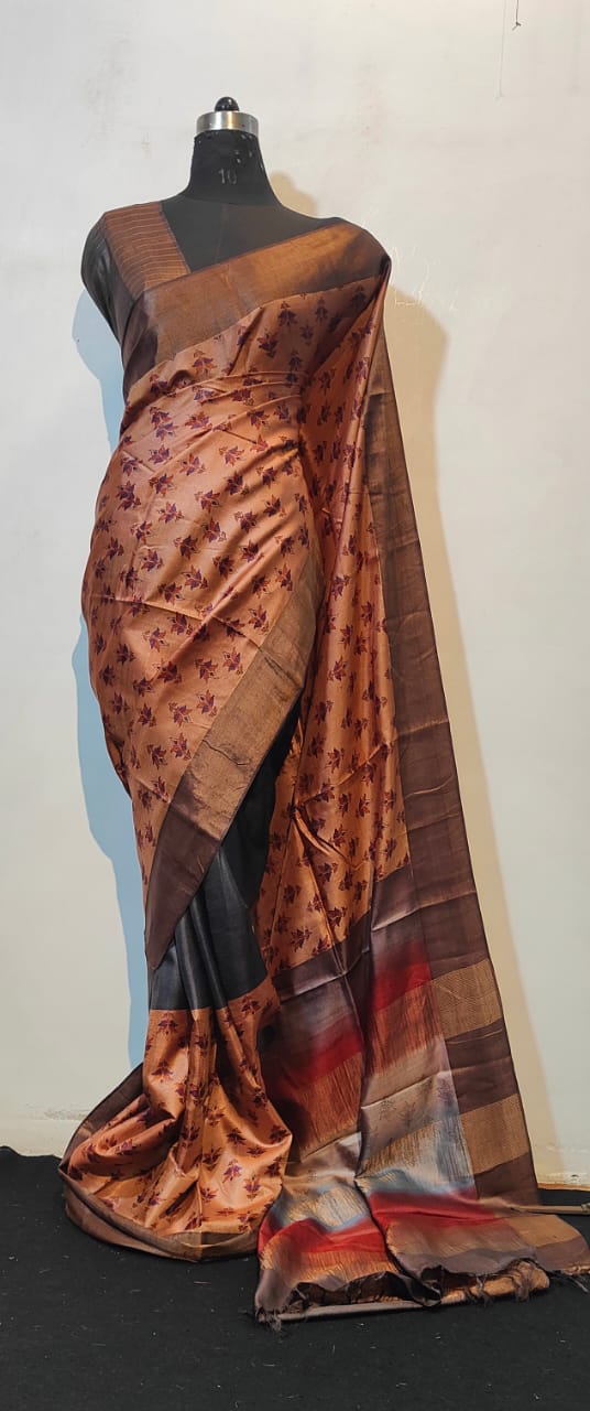 This exquisite copper-brown silk saree is beautifully adorned with subtle floral motifs in maroon, giving it a graceful touch. The saree is enhanced with a rich brown border, adding depth and elegance. Its highlight is the stunning multicolor pallu featuring earthy shades of brown, black, and red, creating a vibrant contrast. A perfect pick for festive occasions, weddings, and cultural gatherings.