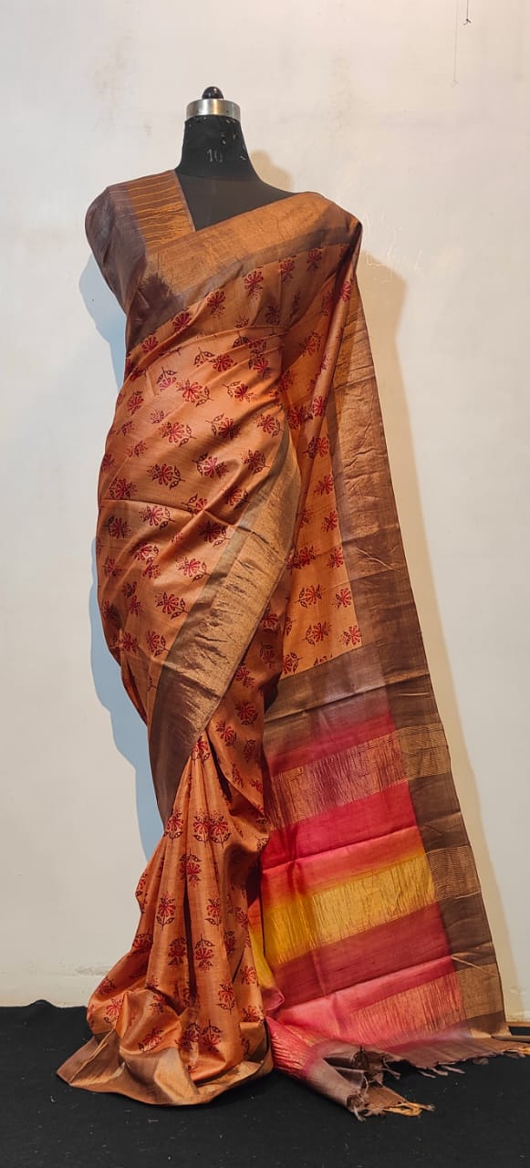 This copper brown silk saree is elegantly adorned with delicate red floral motifs across the body, enhanced by a rich zari border in earthy tones. The pallu features striking shades of red, yellow, and orange, creating a vibrant contrast that adds grandeur. Perfect for festive occasions, weddings, and cultural events, this saree combines traditional charm with contemporary appeal.