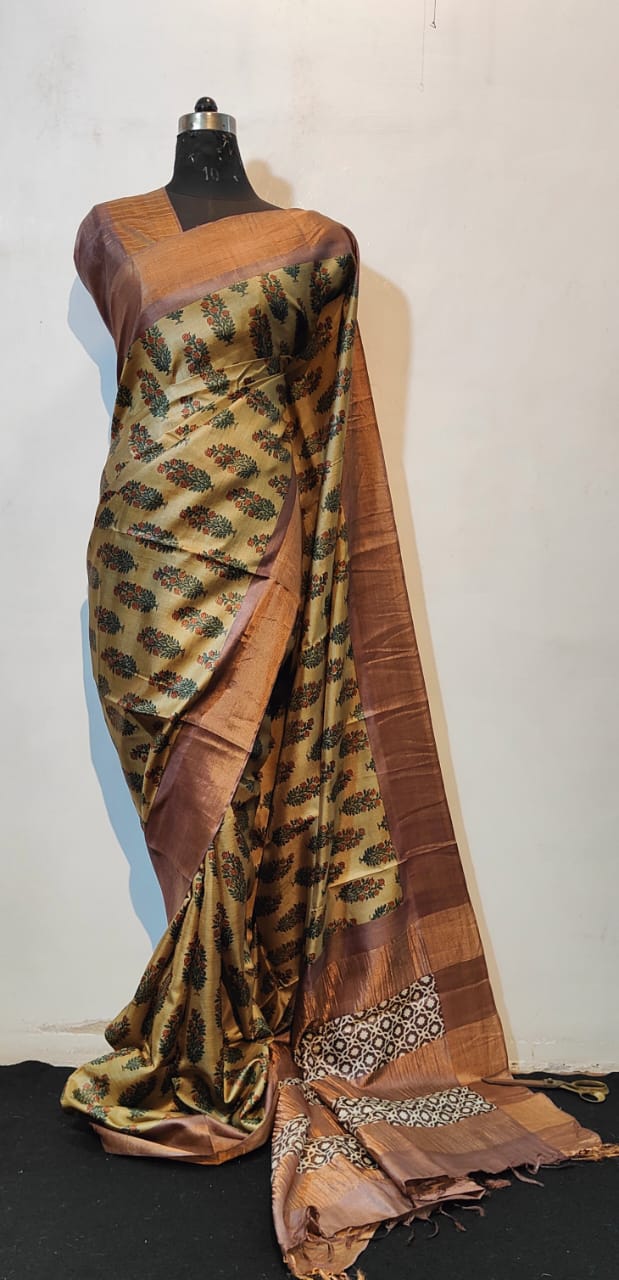 A stunning golden mustard silk saree adorned with intricate paisley prints in multicolor accents. The rich maroon-red border with woven geometric patterns on the pallu adds a regal charm. Perfect for weddings, festive occasions, and cultural events, this saree blends traditional artistry with timeless sophistication.