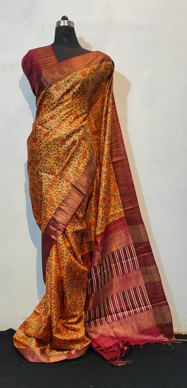 Drape yourself in elegance with this golden yellow silk saree, adorned with delicate leaf motifs all over the body. The saree features a rich red border and pallu, highlighted with traditional striped and woven designs that add a classic touch. Perfect for festive occasions, weddings, and cultural celebrations, this saree brings together vibrant hues and timeless tradition.