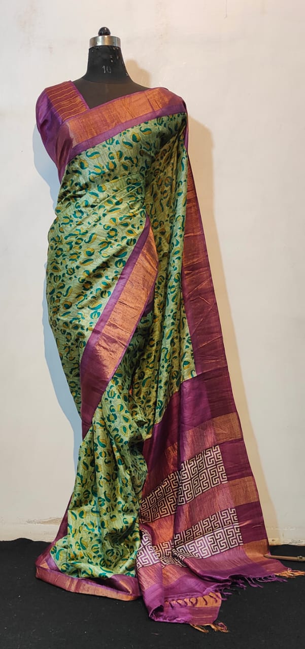 This elegant green silk saree is adorned with delicate peacock-inspired motifs that add a touch of charm and tradition. The rich purple border with golden zari work beautifully contrasts the body, while the pallu features intricate geometric patterns, enhancing its royal appeal. Perfect for festive occasions, weddings, or cultural celebrations, this saree effortlessly blends heritage with sophistication.