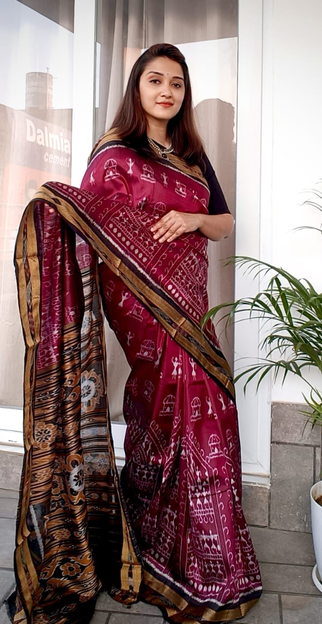 Step into heritage charm with this maroon Ikat Pato saree from Jayanti Sarees