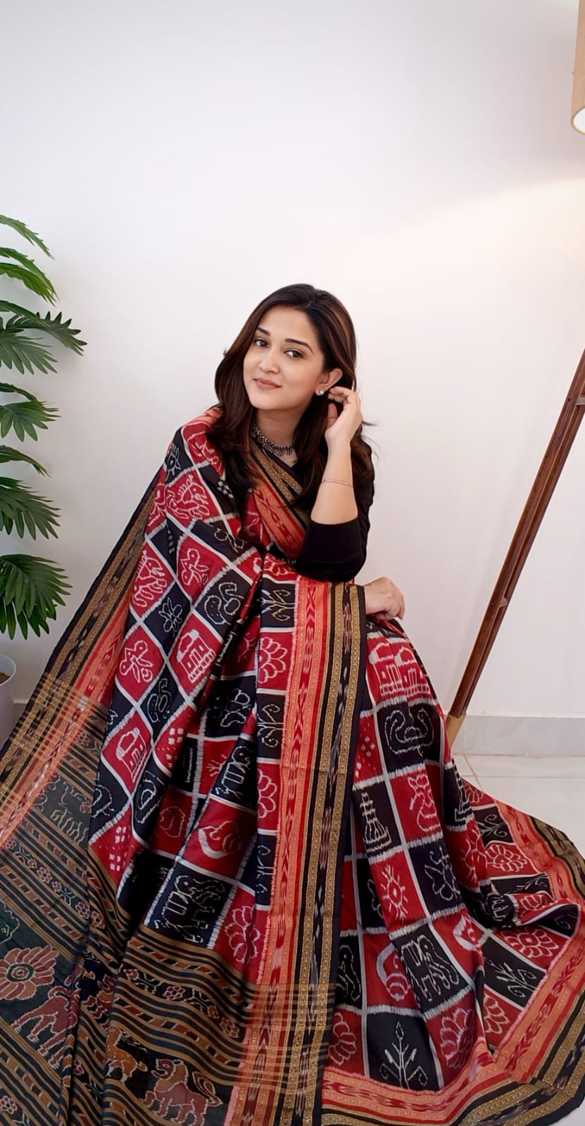 This stunning saree from Jayanti Sarees showcases timeless elegance with its rich red and black. Adorned with traditional and detailed borders, it’s perfect for festive celebrations and cultural gatherings.