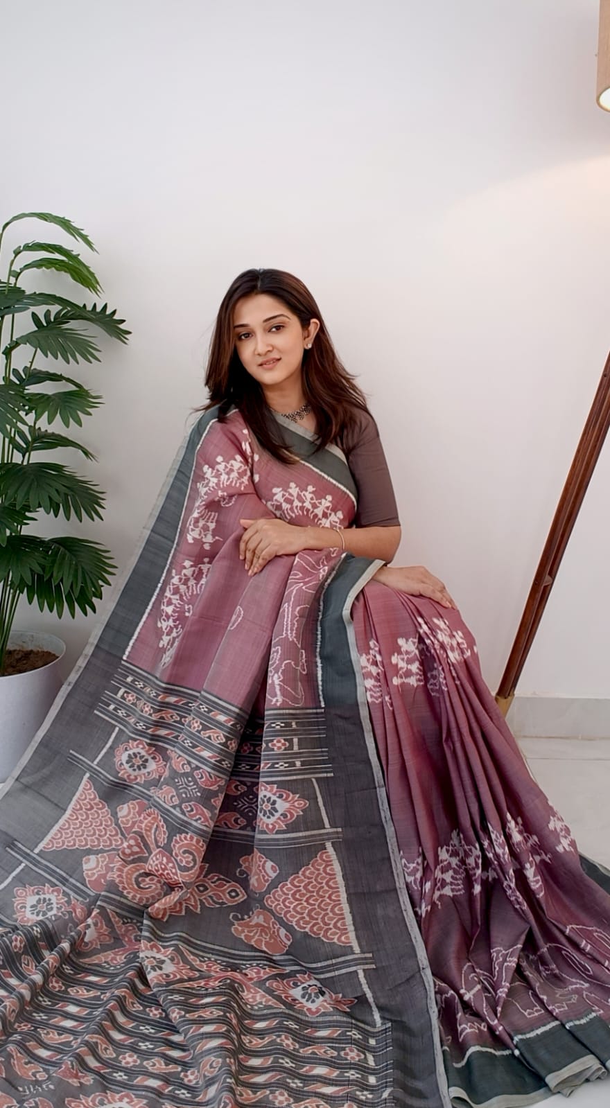 Graceful and understated, this Jayanti Sarees Patola drape features a soothing mauve and grey blend highlighted by delicate white floral motifs and intricate tribal-inspired patterns. A perfect pick for elegant daytime events and cultural occasions.