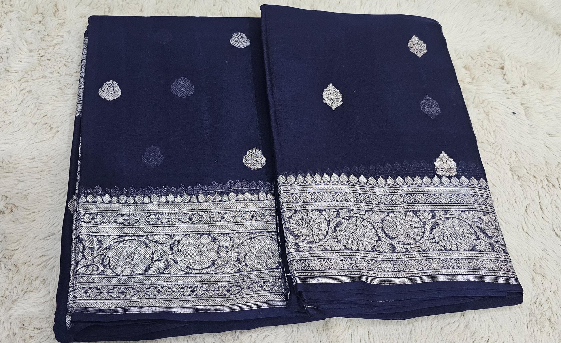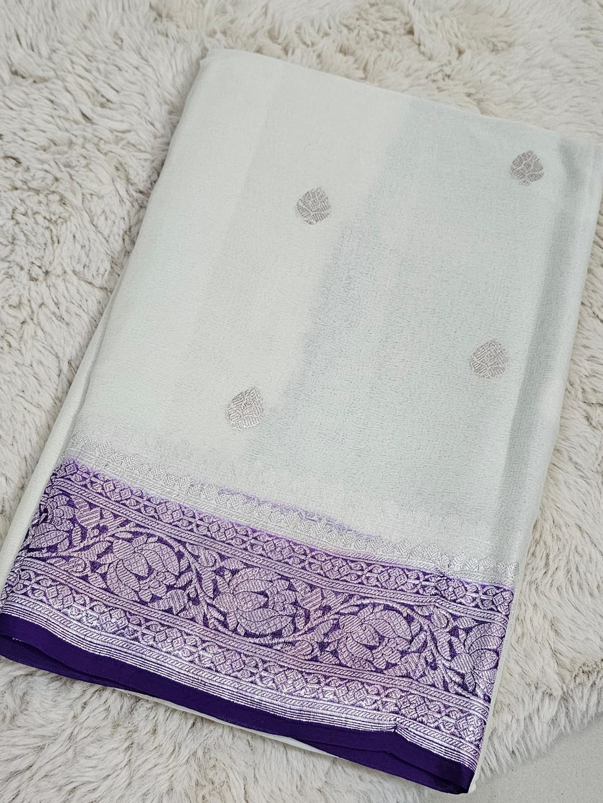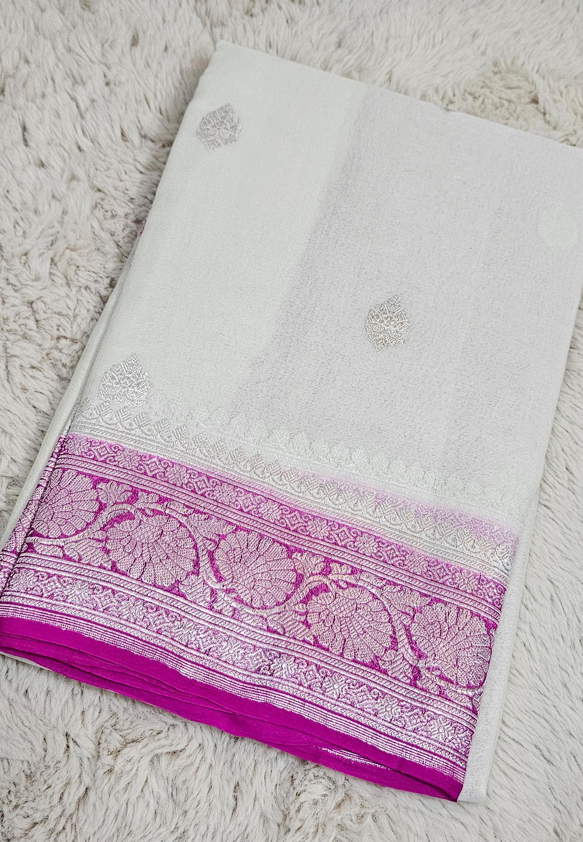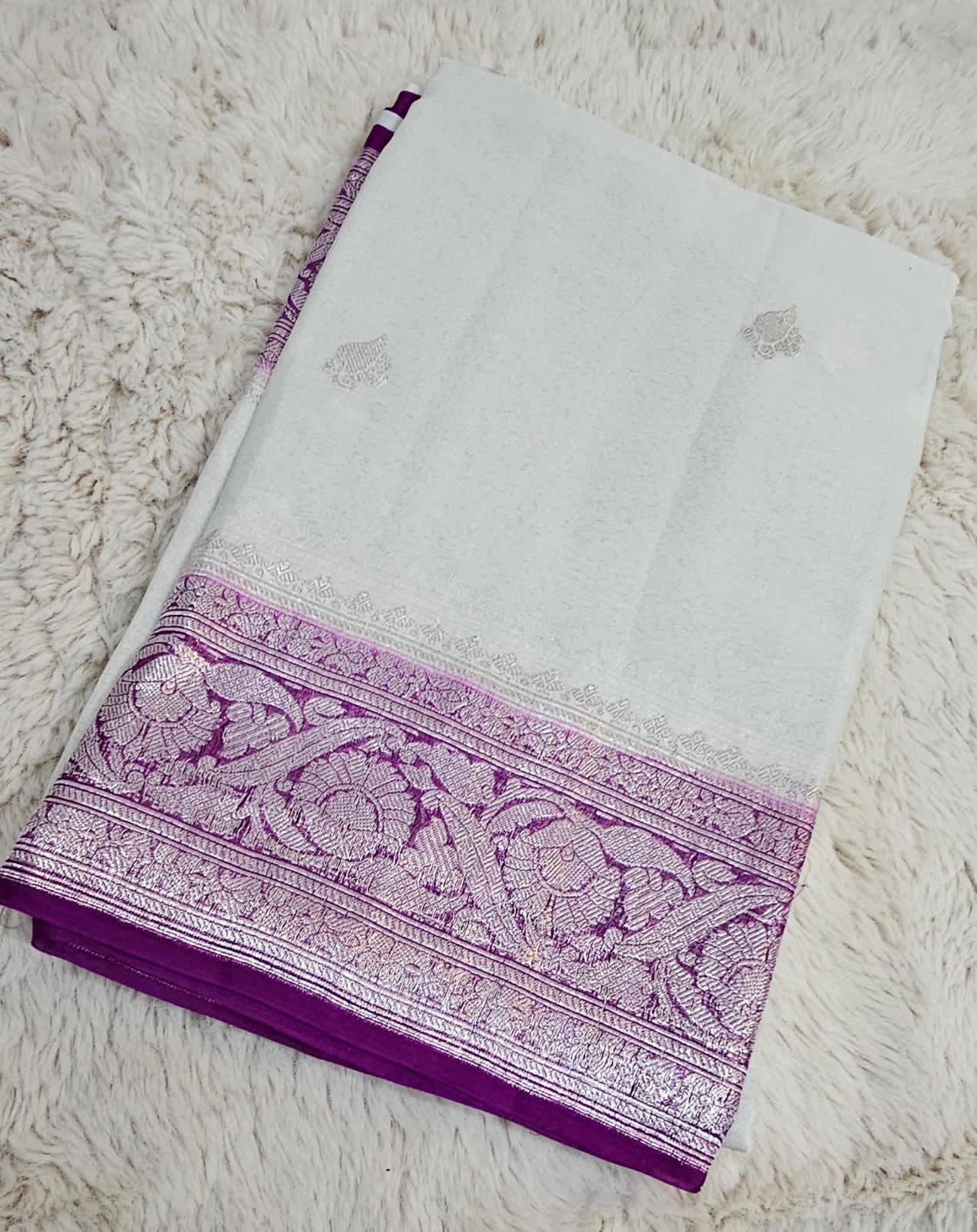 This graceful khadi chiffon Banarasi saree is elevated with silver zari butis and a rich border adorned. Lightweight, soft, and elegant—perfect for daytime festivities, weddings, or traditional gatherings with a modern twist.