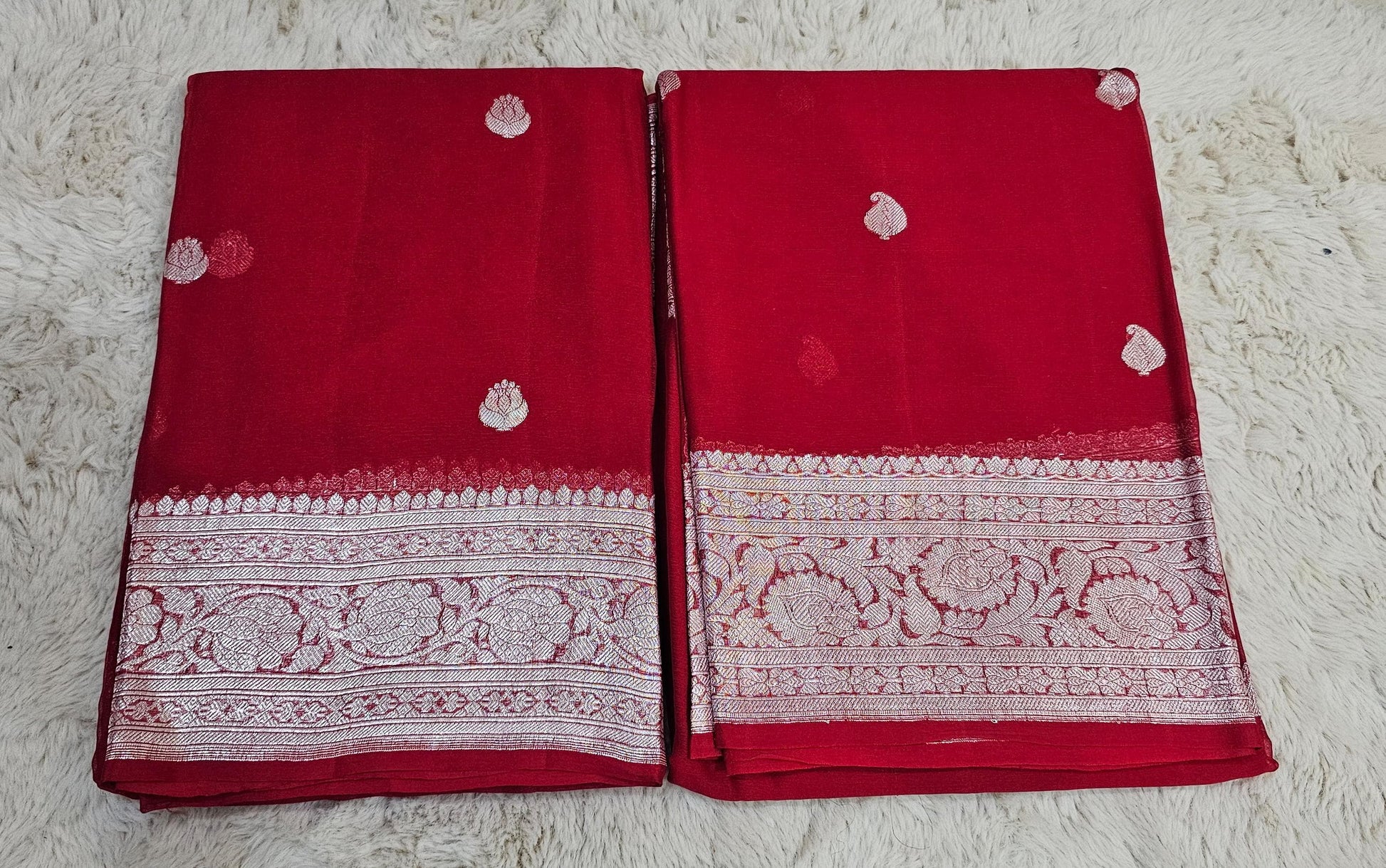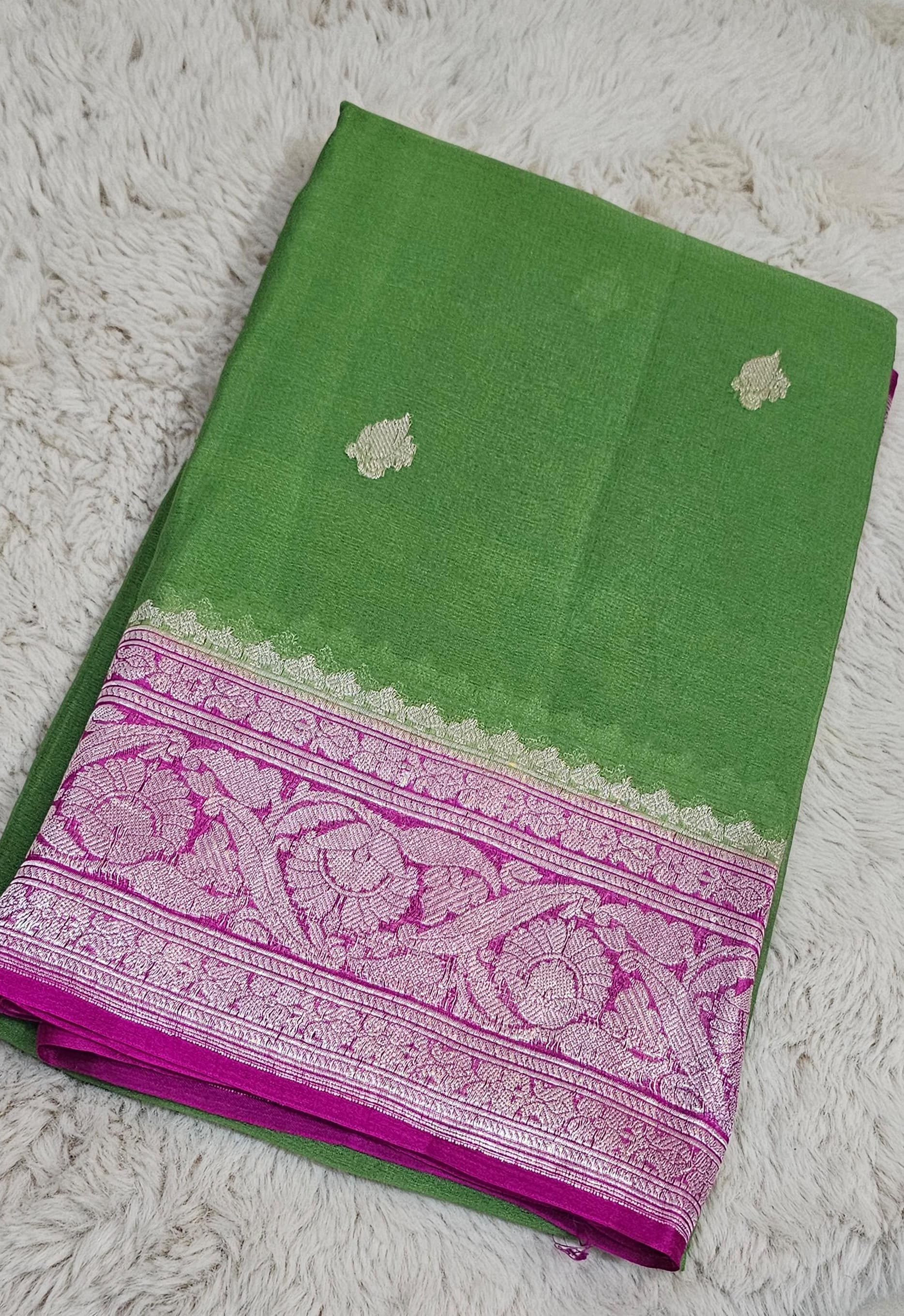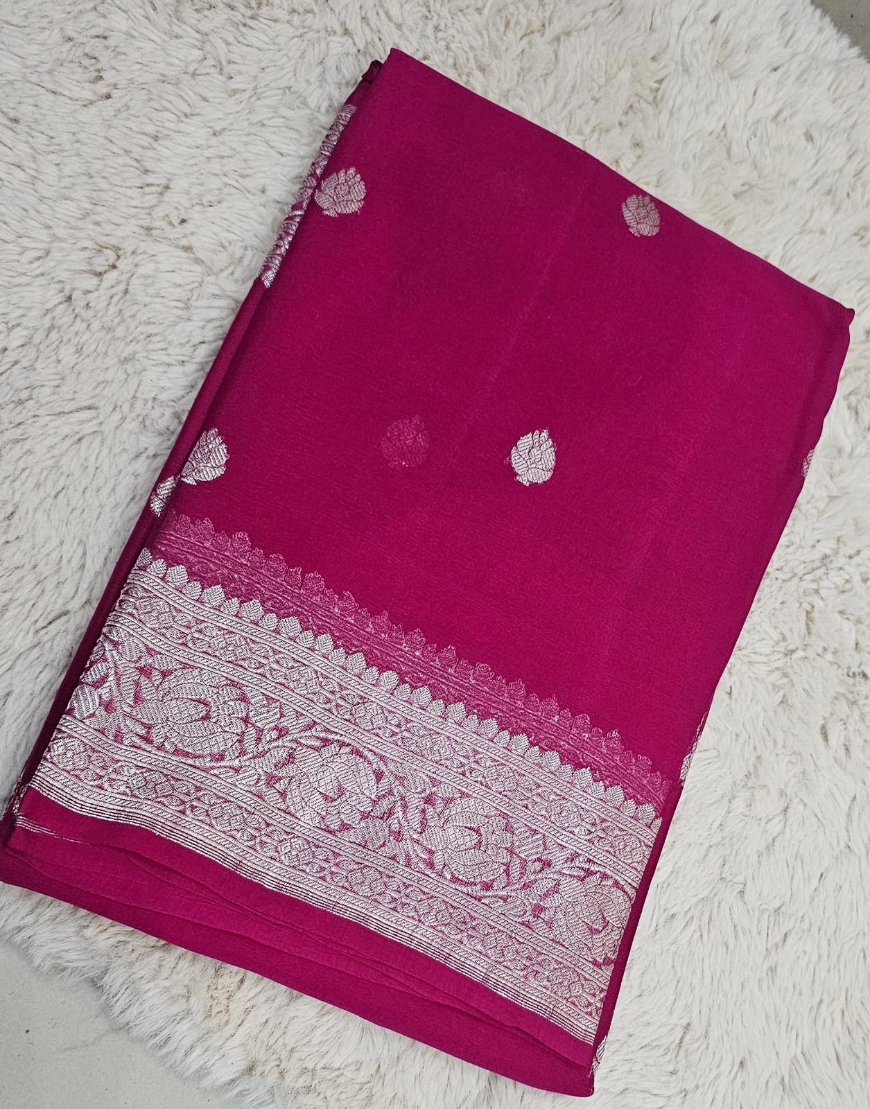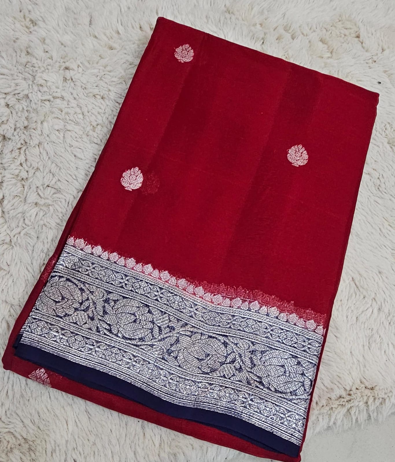 This graceful khadi chiffon Banarasi saree is elevated with silver zari butis and a rich border adorned. Lightweight, soft, and elegant—perfect for daytime festivities, weddings, or traditional gatherings with a modern twist.