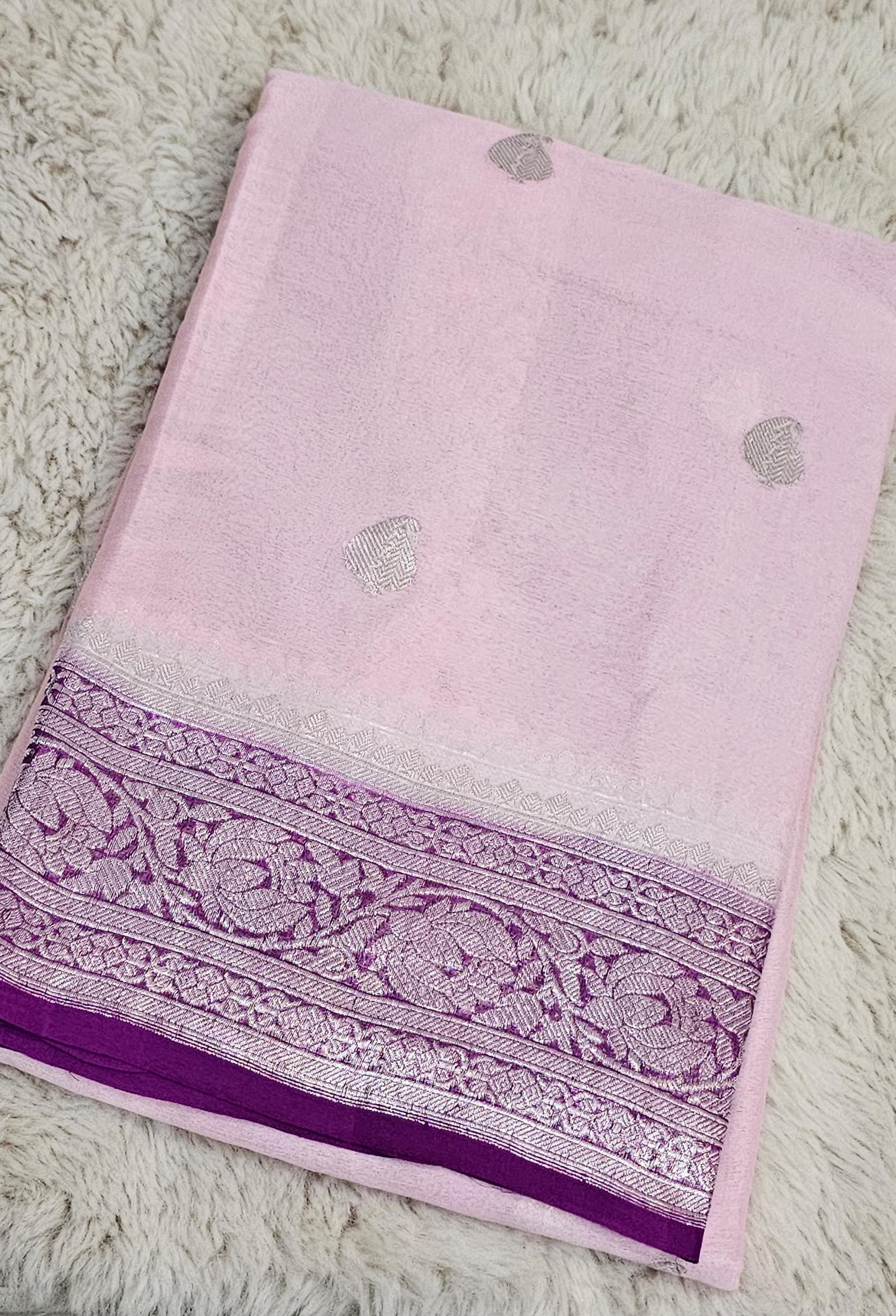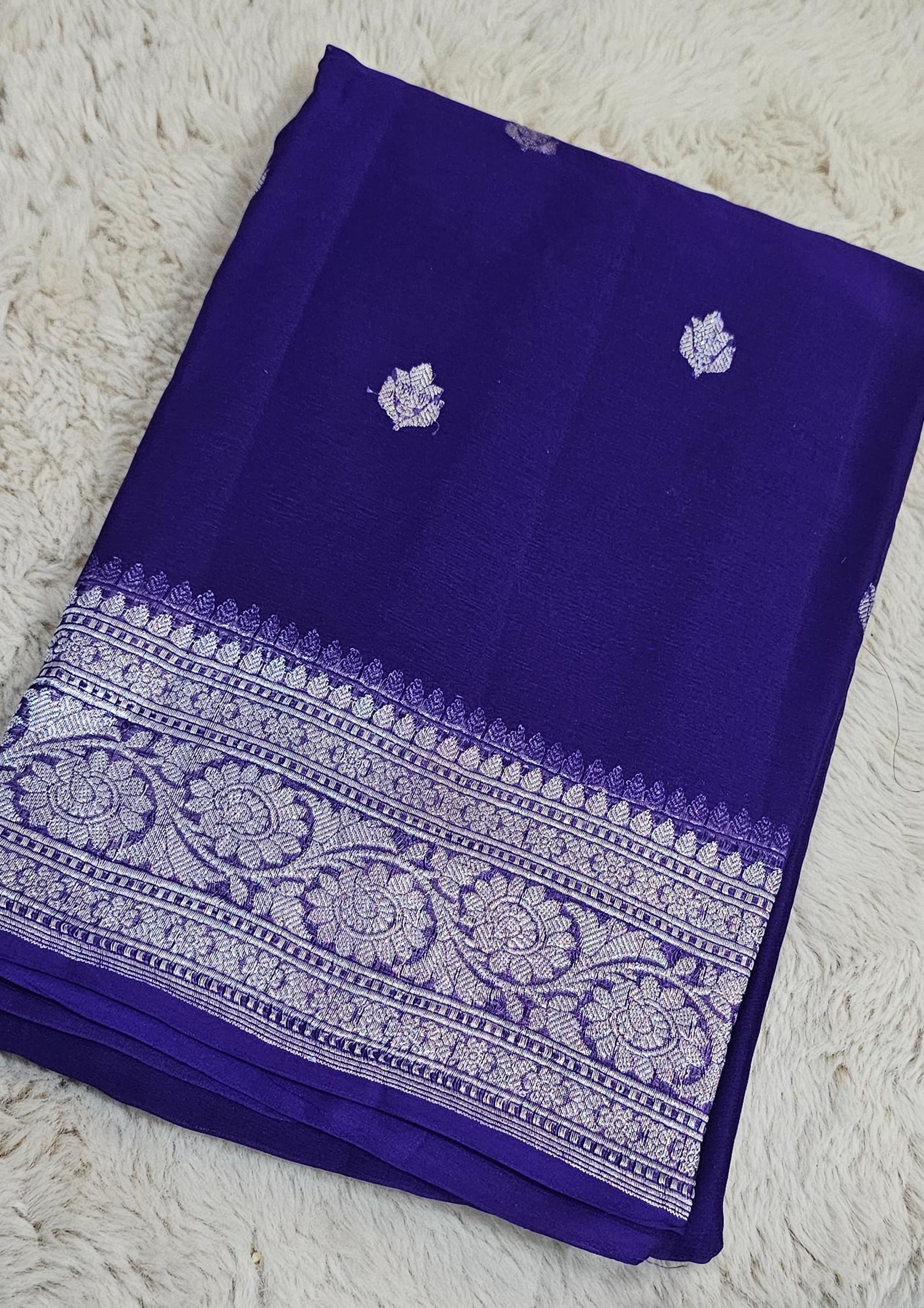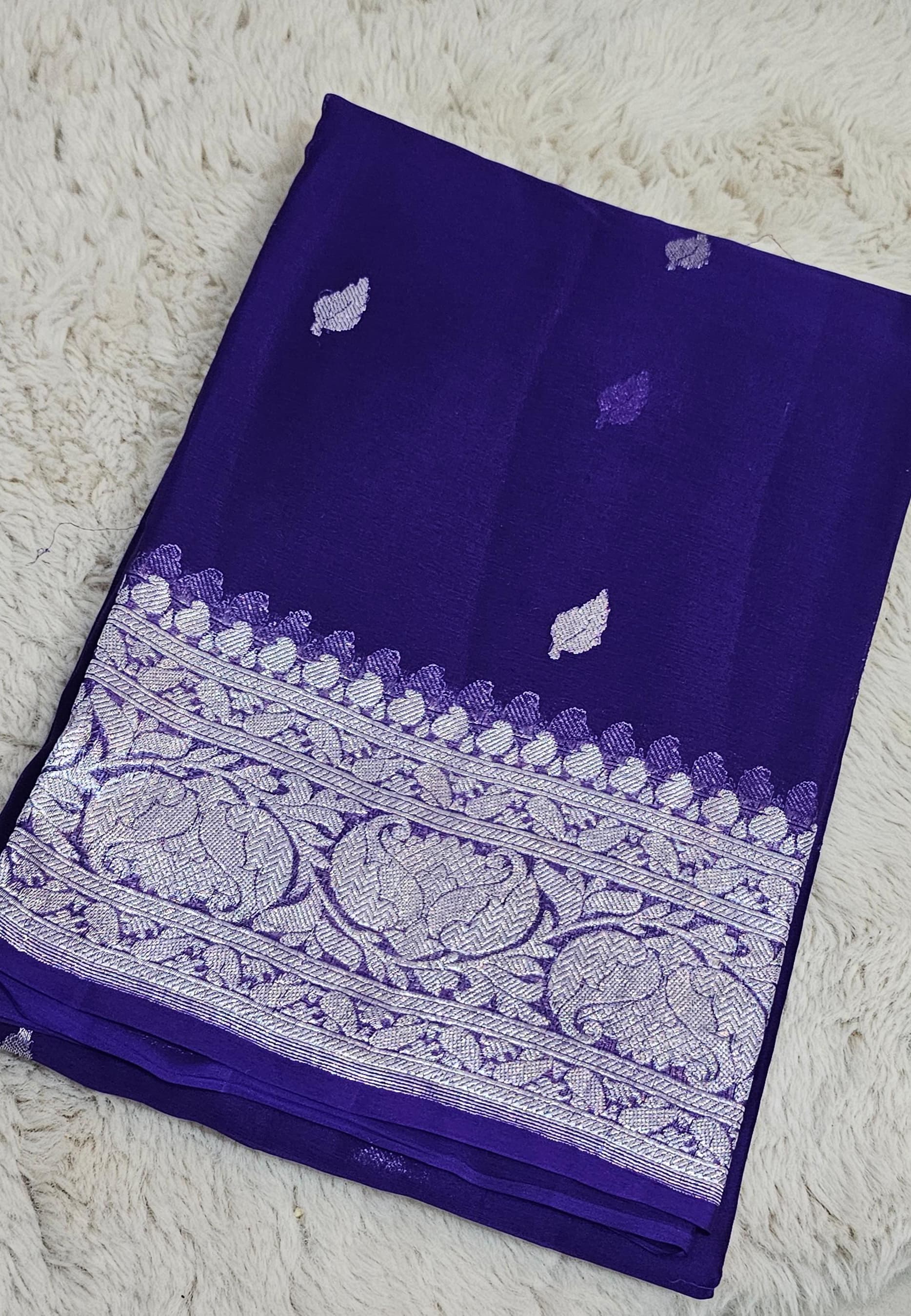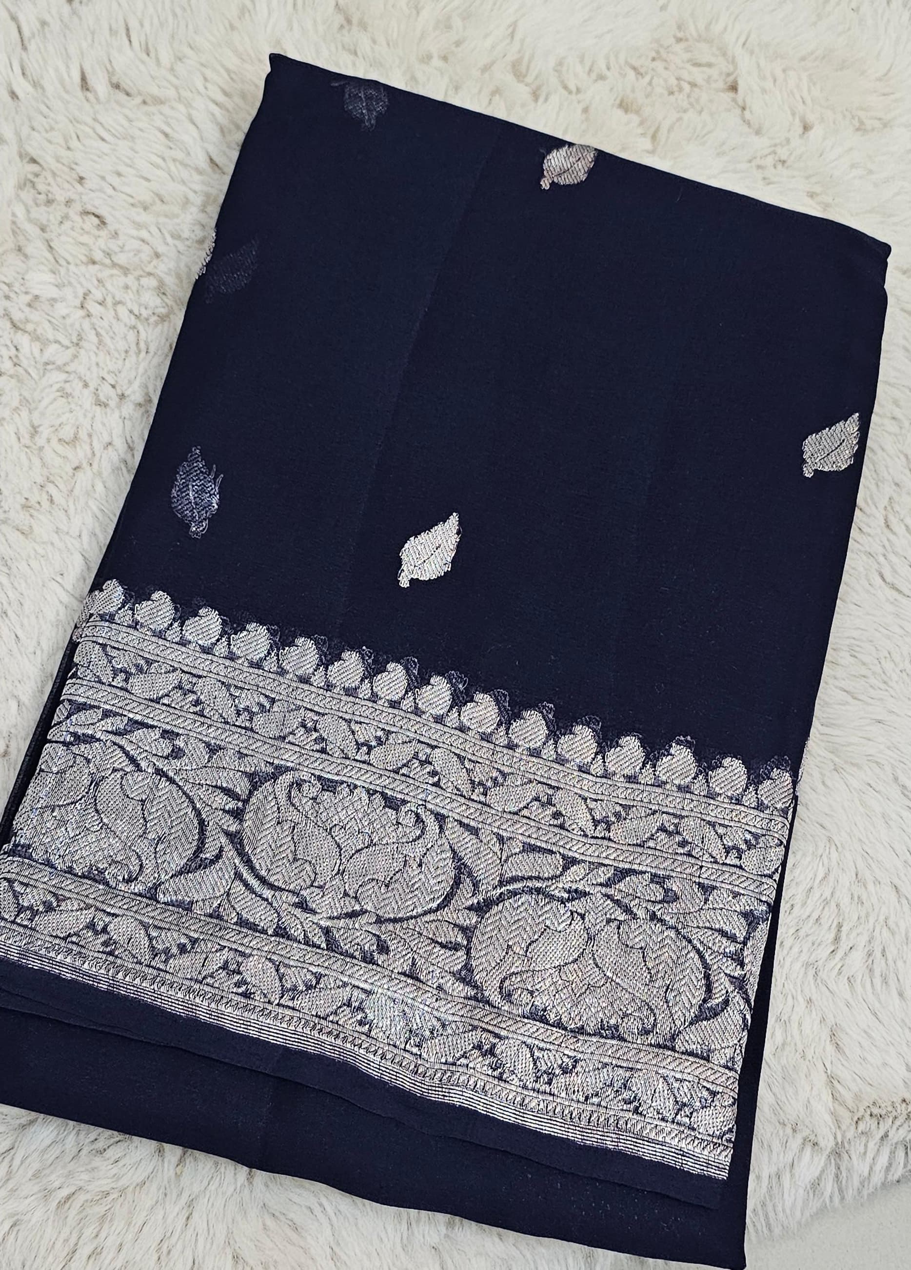 This graceful khadi chiffon Banarasi saree is elevated with silver zari butis and a rich border adorned. Lightweight, soft, and elegant—perfect for daytime festivities, weddings, or traditional gatherings with a modern twist.