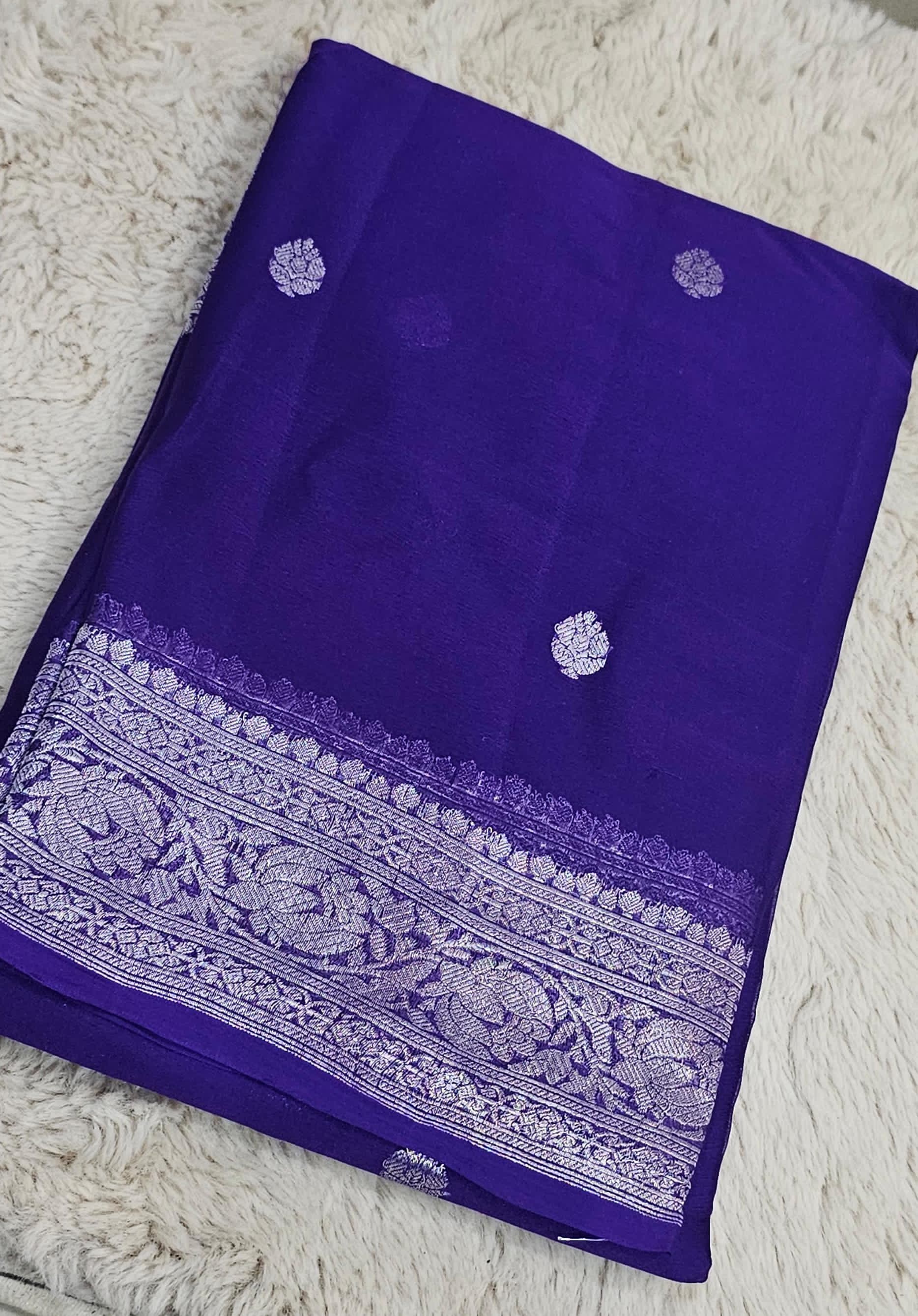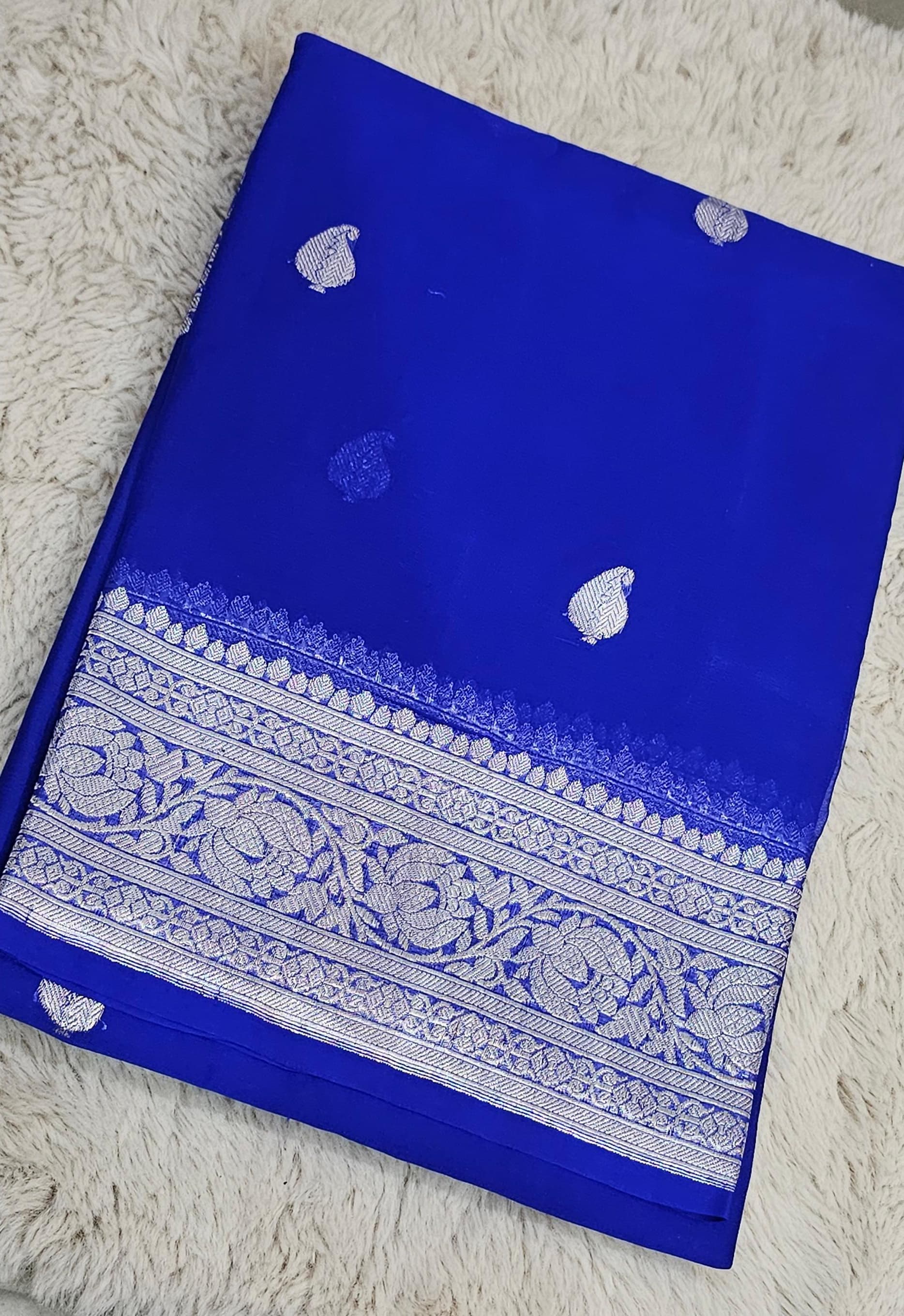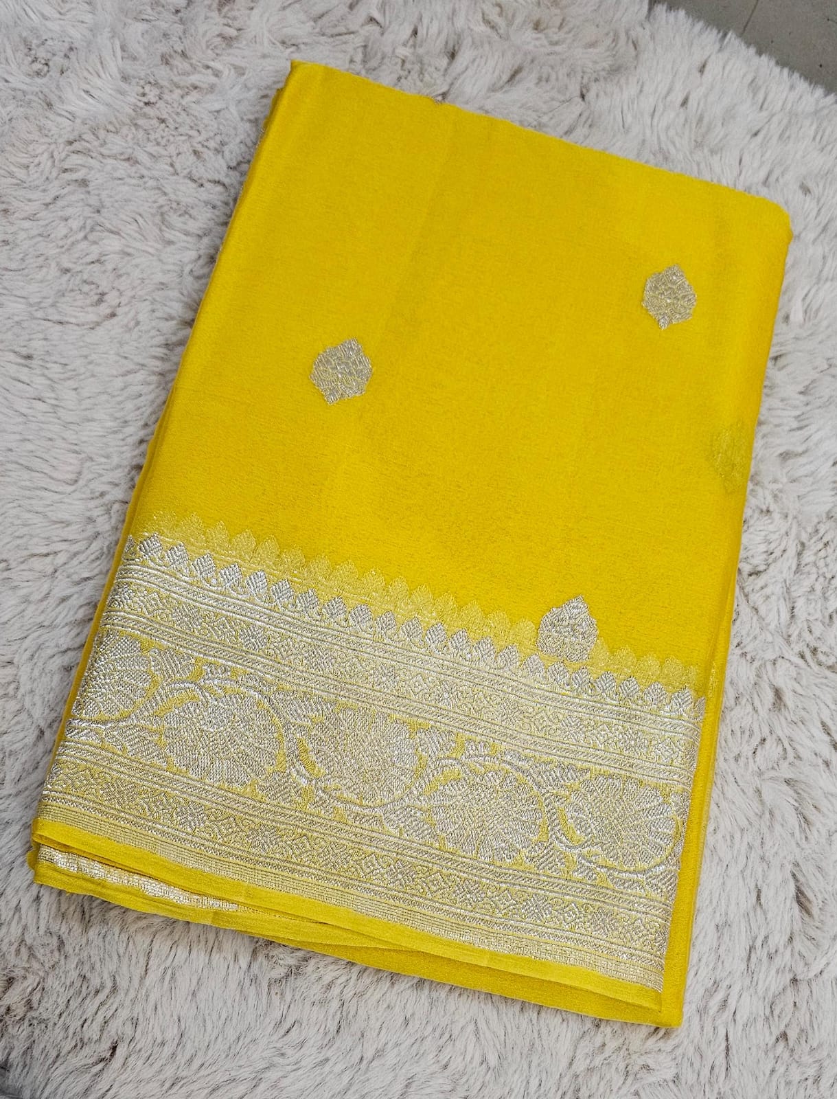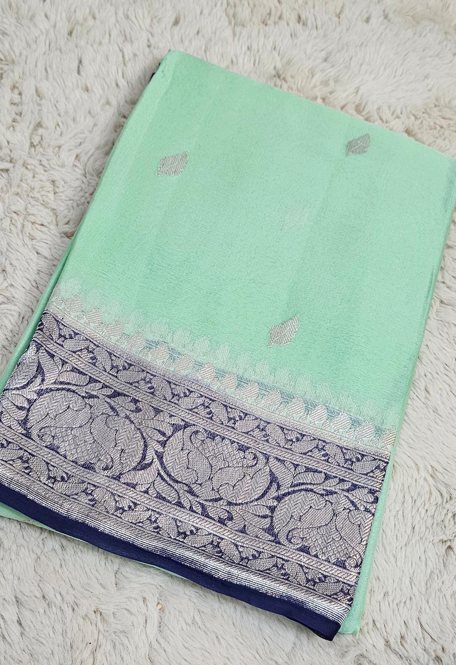 This graceful khadi chiffon Banarasi saree is elevated with silver zari butis and a rich border adorned. Lightweight, soft, and elegant—perfect for daytime festivities, weddings, or traditional gatherings with a modern twist.