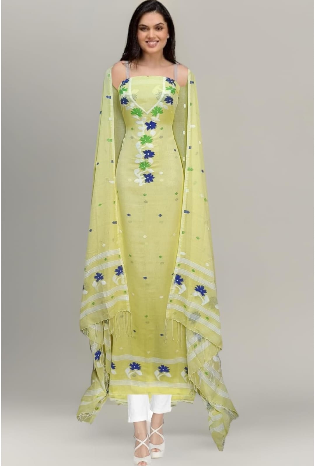 This elegant light green kurta set features a sleeveless design with vertical blue and green floral embroidery that adds a refined touch to the fitted silhouette. The matching dupatta is adorned with white and green striped borders and scattered floral motifs, offering a cohesive and graceful look. Paired with white churidar-style pants and white crisscross-strap heels, the ensemble blends traditional charm with modern styling. Ideal for festive occasions, cultural events, or daytime gatherings, the lightweight fabric and soft color palette make it a versatile choice for warm-weather wear.