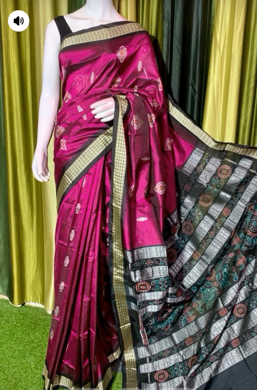 This luxurious magenta silk saree showcases delicate buti work throughout and a bold black pallu detailed with traditional motifs in silver and teal. The subtle golden border adds grace, perfect for weddings or grand celebrations.