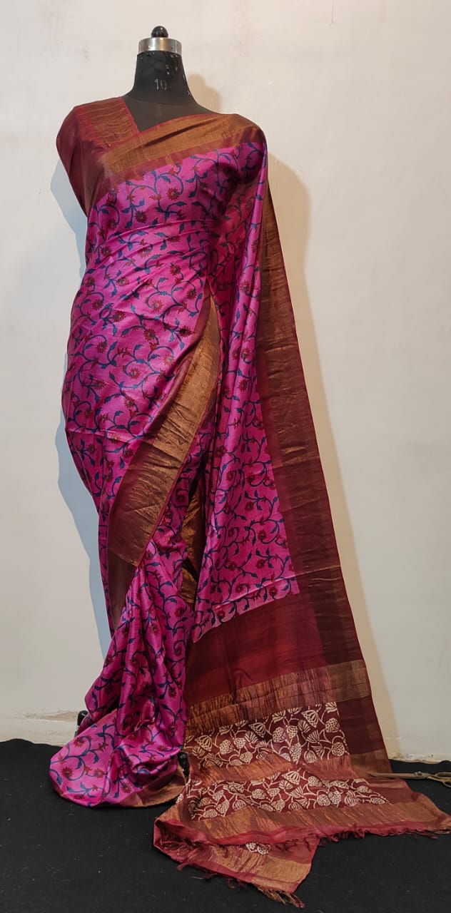 Drape yourself in elegance with this magenta silk saree, adorned with intricate black floral weaving. The rich maroon border and pallu with golden woven motifs add a regal touch, making it a perfect pick for festive occasions, weddings, or cultural celebrations. A timeless blend of vibrant charm and traditional craftsmanship.