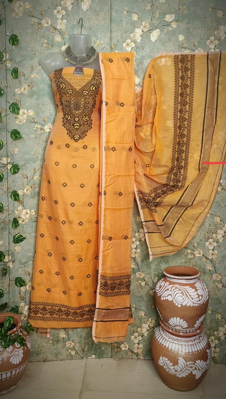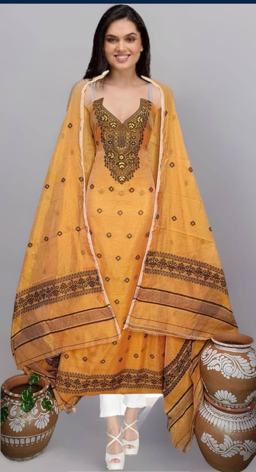 This vibrant mustard yellow kurta set features a sleeveless design with intricate embroidery concentrated around the neckline and chest, showcasing traditional motifs in earthy tones. The matching dupatta adds contrast with black and brown printed borders and scattered motifs, enhancing the outfit’s cultural richness. Paired with white straight-cut pants and white heels, the ensemble offers a balanced blend of festive flair and modern styling. Ideal for daytime celebrations, cultural events, or festive gatherings, this set delivers elegance with a bold color statement.