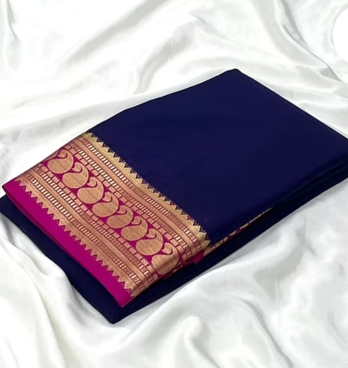 Add royal elegance to your wardrobe with this navy blue saree, featuring a contrasting pink border beautifully detailed with golden zari motifs. The rich color combination enhances its festive charm, making it perfect for weddings, traditional functions, and cultural events. A saree that combines sophistication with timeless ethnic beauty.