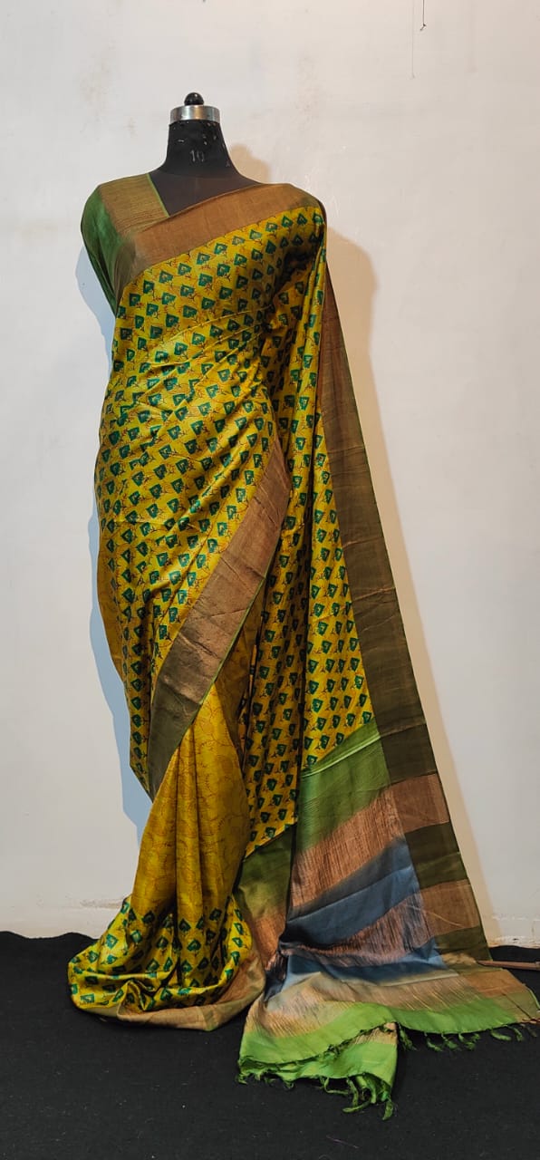 Olive Green Floral Silk Saree with Brown Border and Striped Pallu