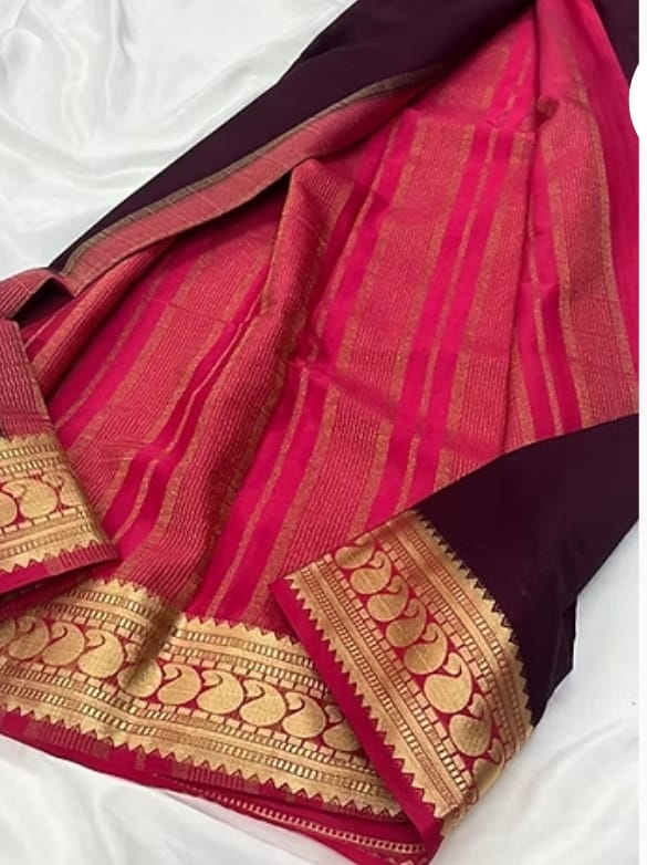 Bring timeless elegance to your ethnic style with this pink saree, beautifully designed with golden zari stripes and a contrasting maroon border. The intricate zari motifs add a festive charm, while the rich color combination gives it a regal look. Perfect for weddings, traditional functions, and festive occasions, this saree is a graceful blend of heritage and sophistication.