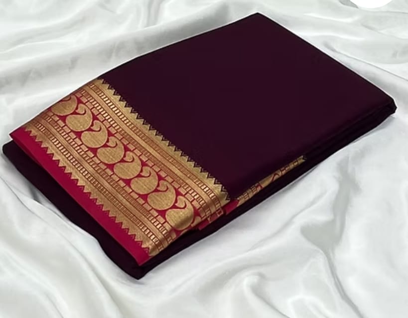 Add richness to your ethnic collection with this elegant plum maroon saree, beautifully finished with a golden zari border featuring bold circular motifs. The deep shade enhances its regal charm, while the zari detailing reflects traditional artistry. Perfect for weddings, festive occasions, and cultural events, this saree is a graceful blend of sophistication and tradition.