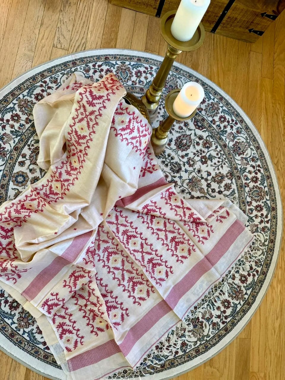 🧶 Craftsmanship: Handloom woven with delicate motifs and border detailing