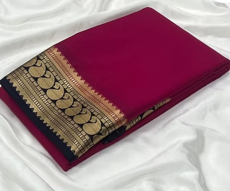 Stand out with this vibrant rani pink saree, beautifully contrasted with a black border enriched with golden zari circular motifs. The bold color combination gives it a festive appeal, while the zari weaving reflects elegance and tradition. Ideal for weddings, cultural ceremonies, and festive occasions, this saree is a perfect blend of vibrance and sophistication.