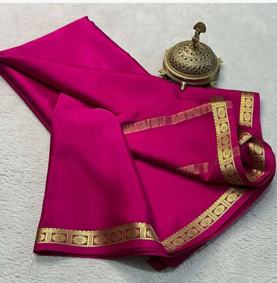 Step into timeless elegance with this stunning rani pink saree, beautifully finished with a golden zari border featuring traditional geometric motifs. The rich pink shade adds vibrance, while the zari detailing enhances its festive charm. Ideal for weddings, festive occasions, and cultural gatherings, this saree is a perfect blend of simplicity and sophistication.