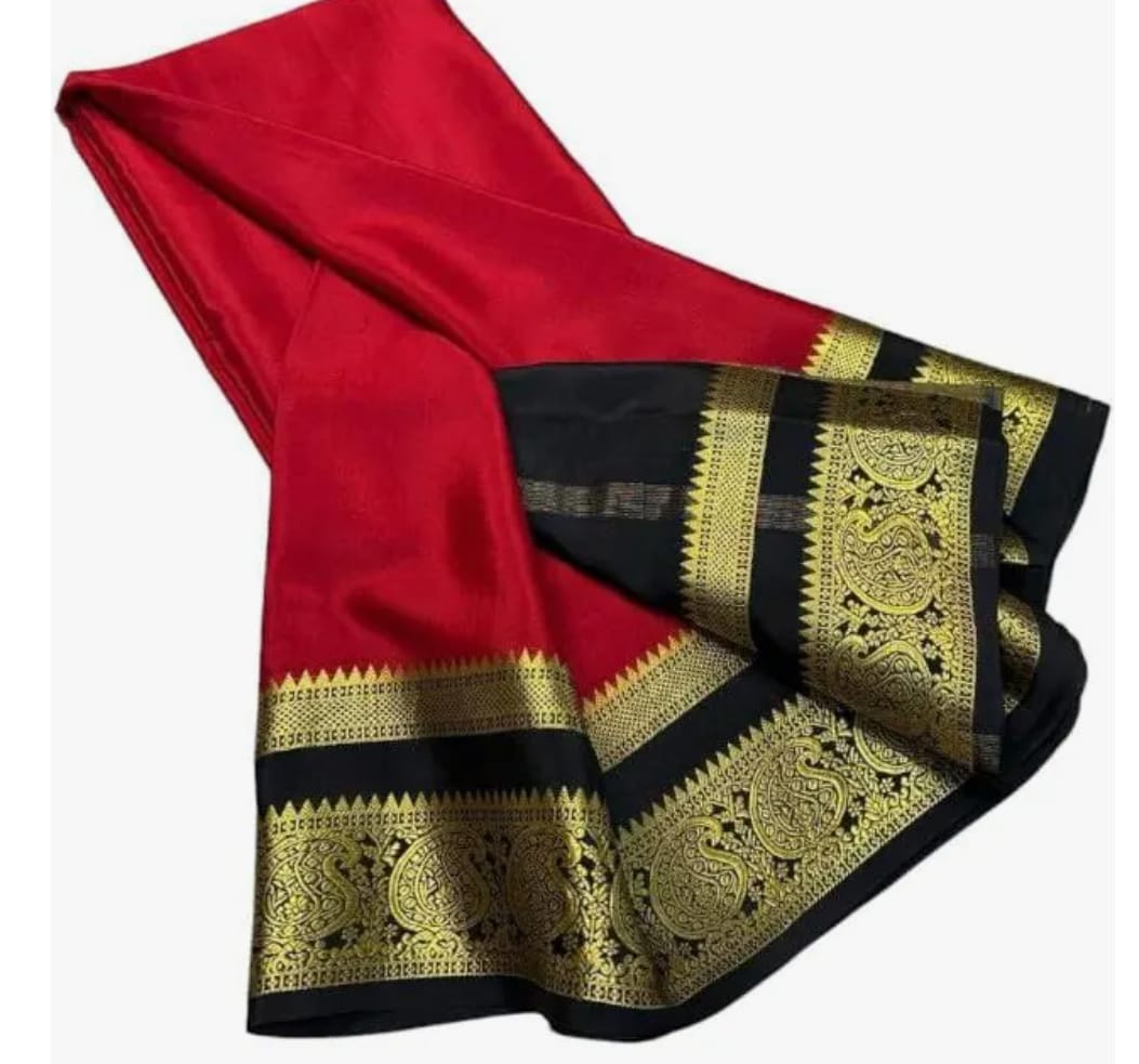 Turn heads with this striking red saree, paired with a bold black border intricately woven with golden zari paisley motifs. The contrast of vibrant red with elegant black makes it a timeless ethnic statement, while the detailed zari weaving adds a touch of grandeur. Perfect for weddings, festive occasions, and evening celebrations, this saree beautifully blends tradition with sophistication.
