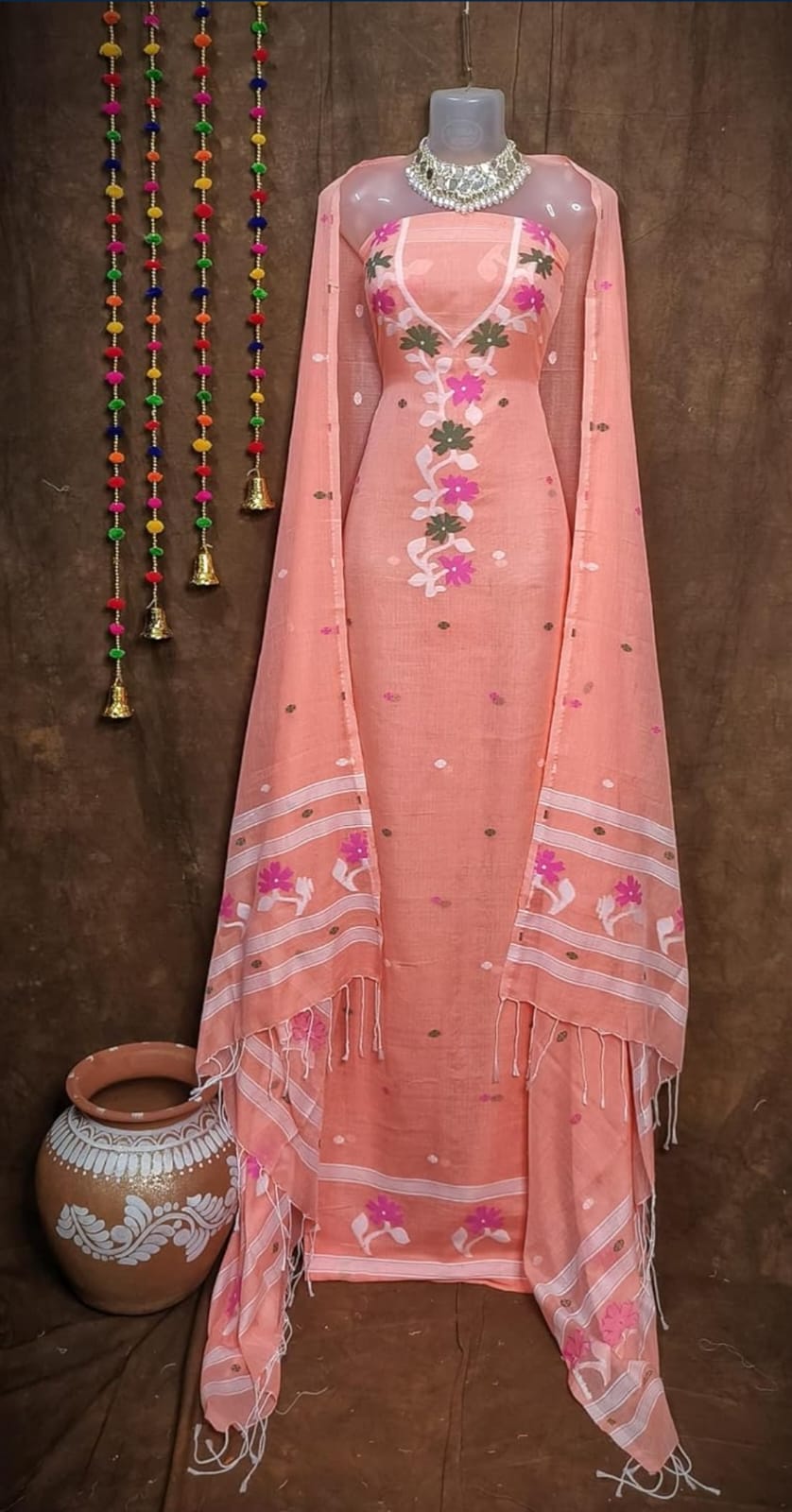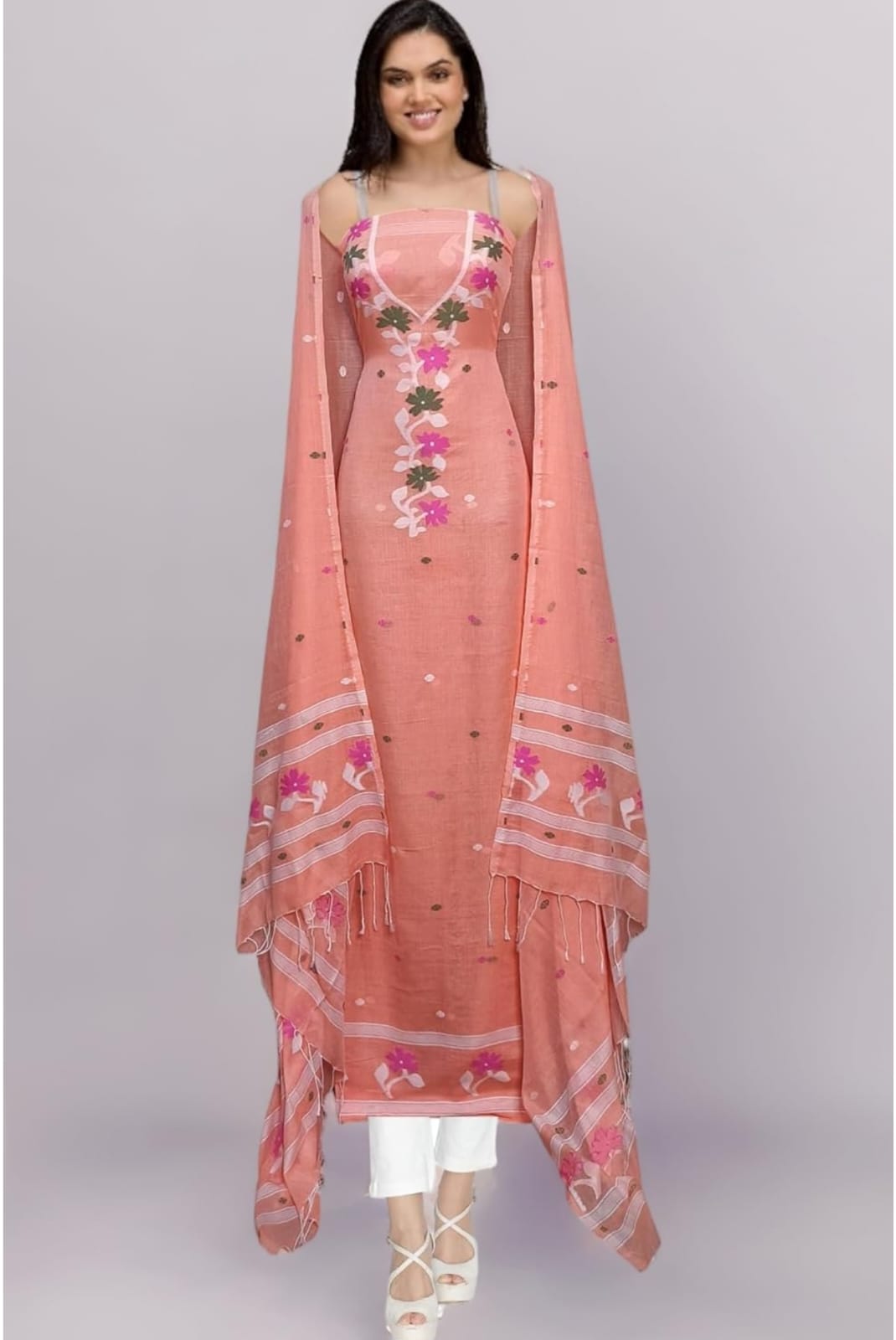 This graceful kurta set features a soft pink sleeveless kurta embellished with vertical floral embroidery in complementary tones, creating a refined and feminine silhouette. The matching dupatta mirrors the kurta’s embroidery with delicate motifs and a detailed border, offering a cohesive and elegant look. Paired with crisp white straight-cut pants and white heels, the ensemble balances tradition with modern styling. Ideal for festive events, cultural gatherings, or semi-formal occasions, this outfit combines comfort with understated charm.