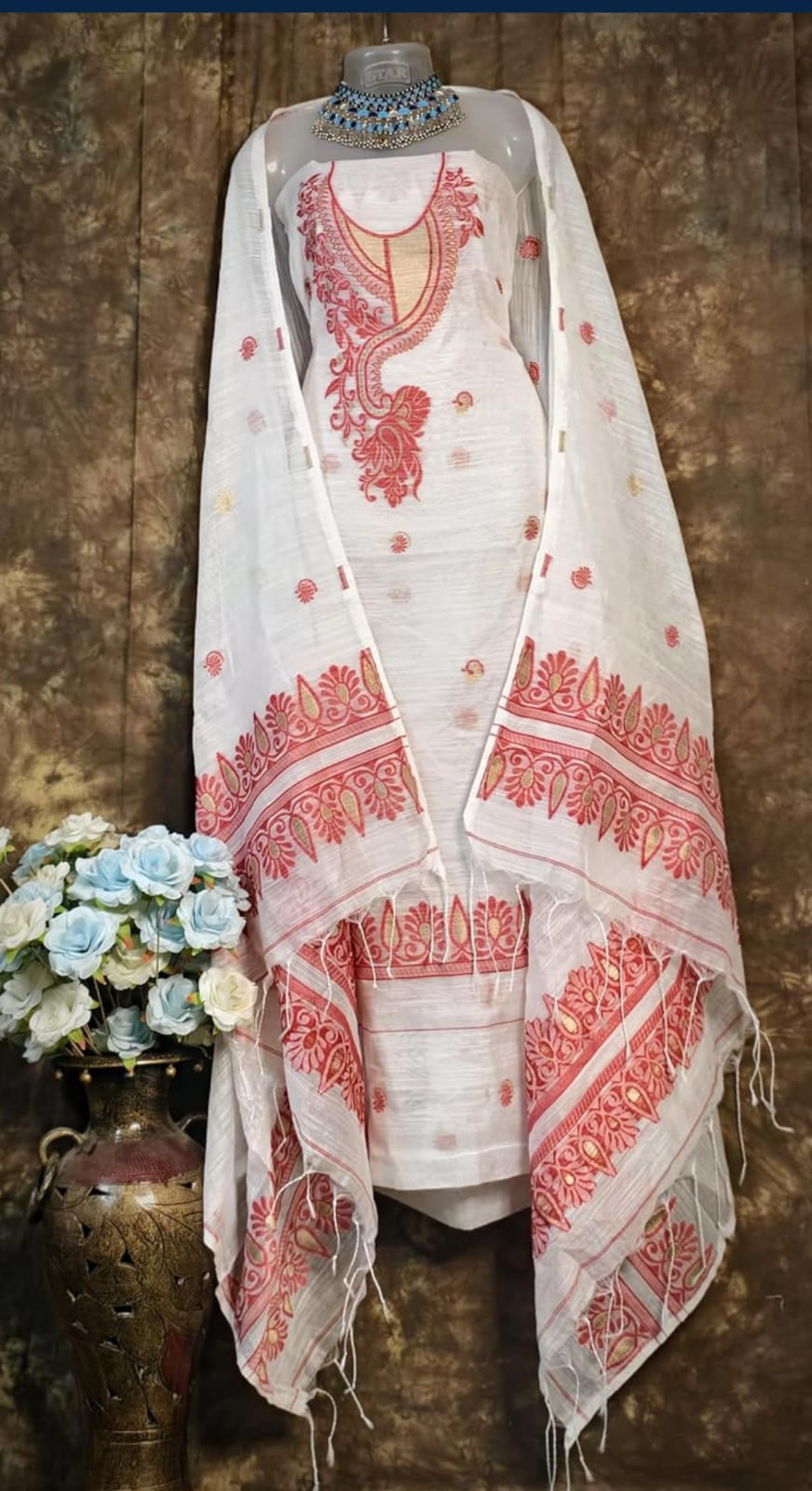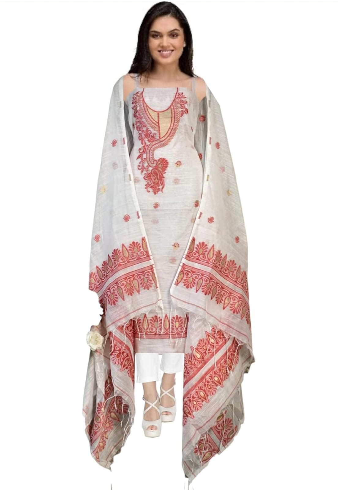 This elegant ethnic suit set features a sleeveless white kameez adorned with intricate red embroidery, highlighted by a central paisley motif and delicate border detailing. Paired with straight white pants and a matching white dupatta showcasing coordinated red floral and geometric embroidery, the ensemble offers a refined and festive look. Crafted from lightweight, semi-transparent fabric, it’s ideal for formal gatherings, cultural events, or festive occasions. The clean silhouette and vibrant contrast make it suitable for both traditional and contemporary styling.