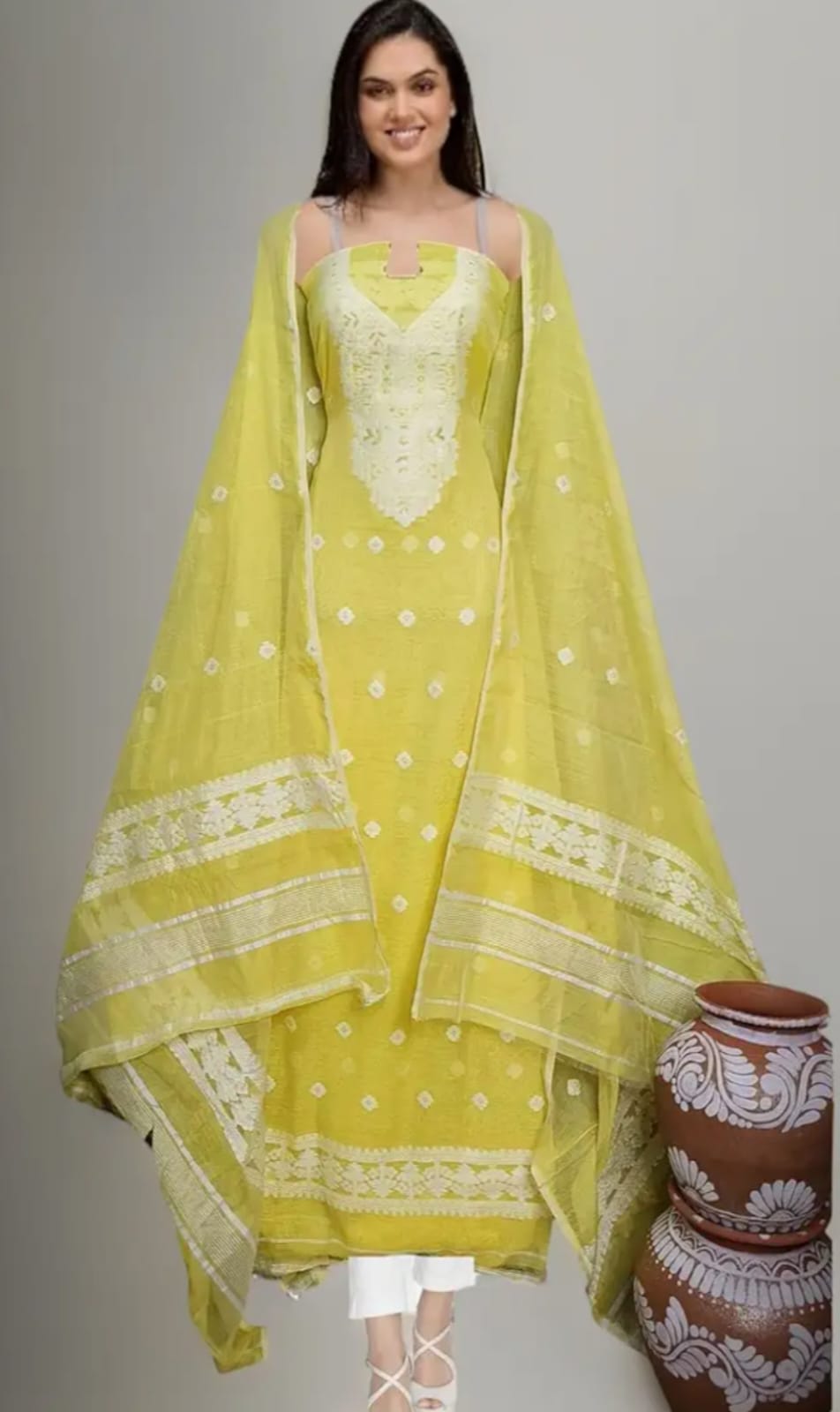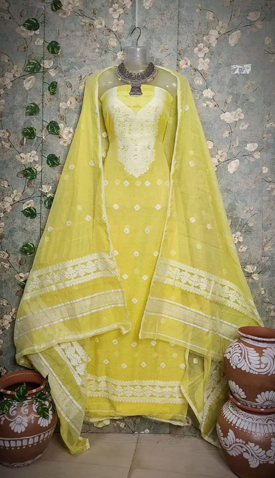 This bright yellow kurta set features a sleeveless design with intricate white floral and geometric embroidery across the front panel. The matching dupatta is adorned with coordinated embroidery and bordered edges, adding elegance and cohesion to the ensemble. Paired with white churidar-style pants and white heels, the outfit offers a clean and festive look ideal for daytime events, cultural celebrations, or seasonal gatherings. The lightweight fabric and vibrant color make it a standout choice for warm-weather occasions, blending traditional charm with modern simplicity.